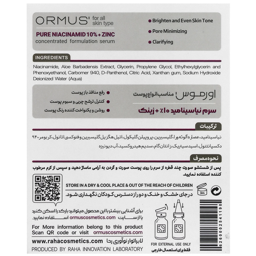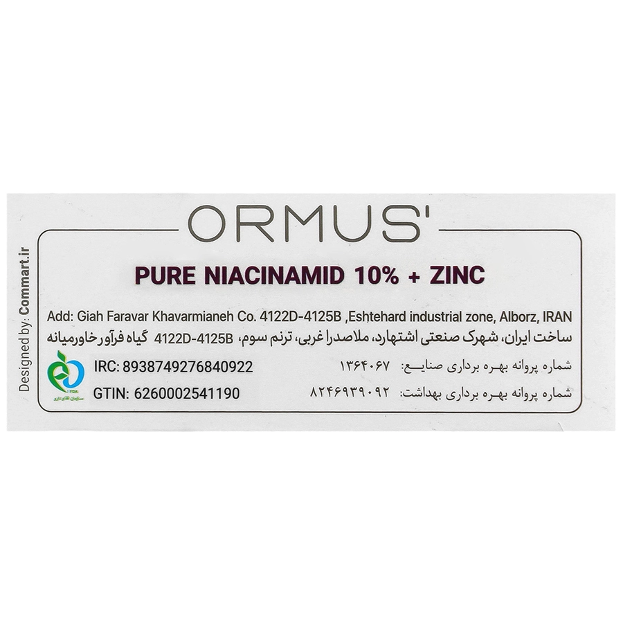 لیست ترکیبات سرم نیاسینامید و زینک Ormus